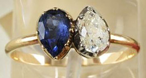На торгах французского аукционного дома Osenat было продано уникальное кольцо, которое император Франции Наполеон Бонапарт подарил Жозефине в честь помолвки в 1796 году. Это золотое кольцо с оправой 18 века (есть даже специальное название для этого типа и дизайна оправы – «toi et moi” – «ты и я»), в которой закреплены напротив друг друга 2 камня огранки «груша» - синий сапфир и бриллиант, каждый массой менее карата.